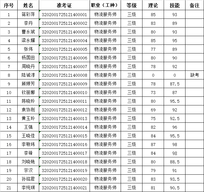 2025年12月14日,21名企业人员参加物流服务师三级技能等级认定考试(考试批次:2025-32020017-00050),共计21名成绩获得合格。现将考试成绩公示如下:
