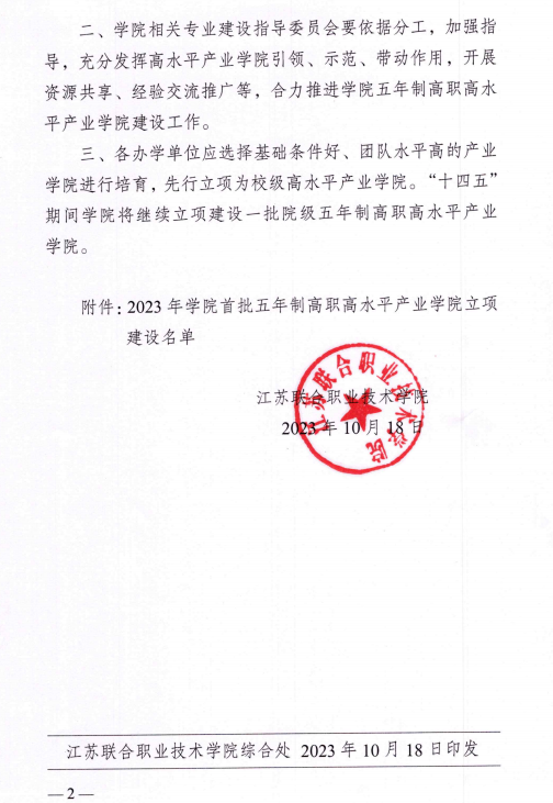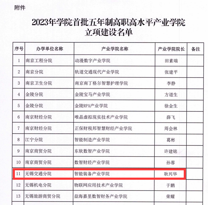 根据江苏联合职业技术学院《关于公布2023年学院首批五年制高职高水平产业学院立项建设名单的通知》(苏联院教〔2023〕36号)文件,学校“智能装备产业学院”获立项建设。