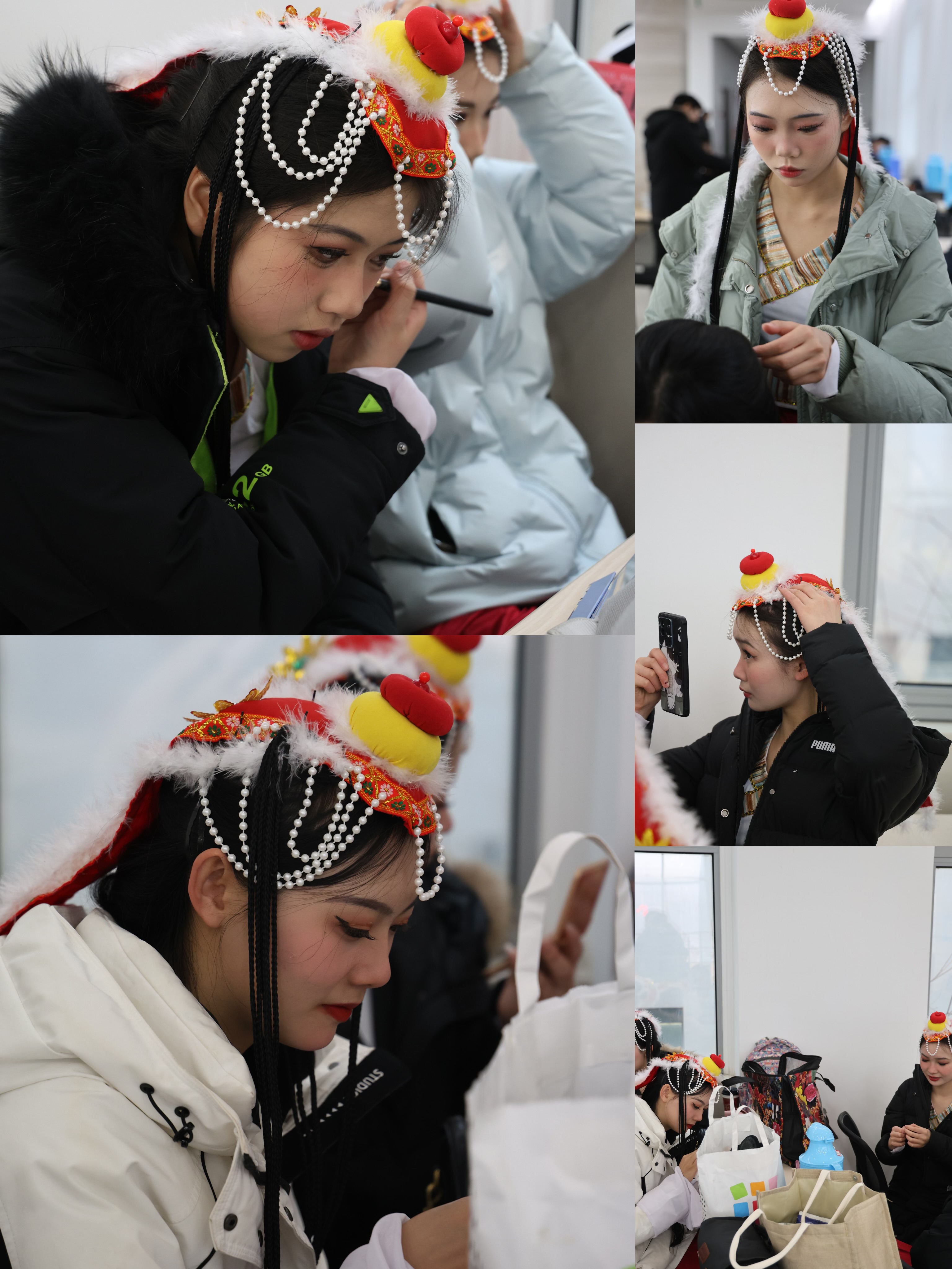 10名参演学生在寒假期间,积极投入排练,放弃休息,克服严寒,一次次的完善动作,一遍遍地练习表情,不断打磨节目,每个动作都反复斟酌,力求达到最完美的状态,最终出色地完成了演出任务。他们在演出现场集合、换衣服、化妆、彩排、候场,演出,拍照留念,忙碌辛苦但抵不住他们认真热情的模样。