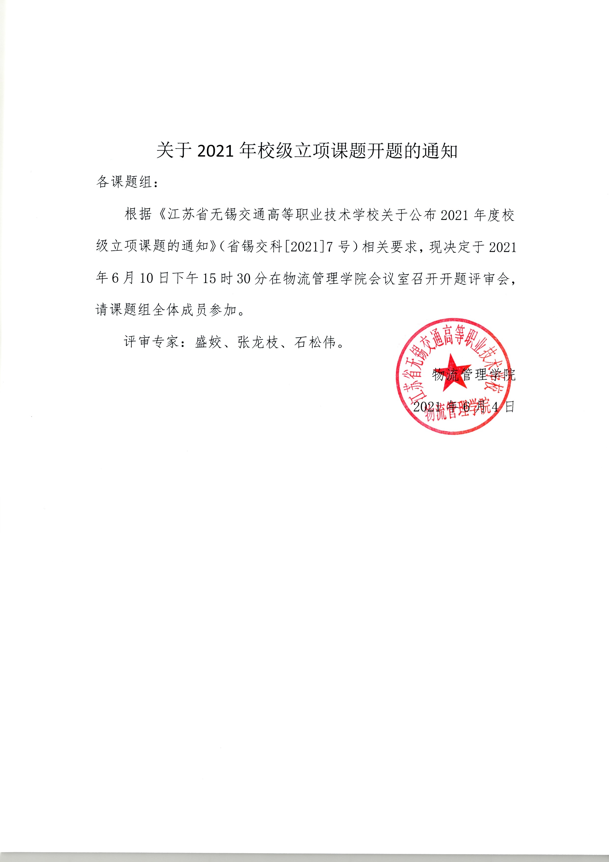 根据《开云·官方端网页版登录入口关于公布2021年度校级立项课题的通知》(省锡交科[2021]7号)相关要求,现决定于2021年6月10日下午15时30分在物流管理学院会议室召开开题评审会,请课题组全体成员参加。