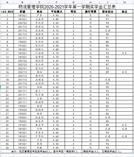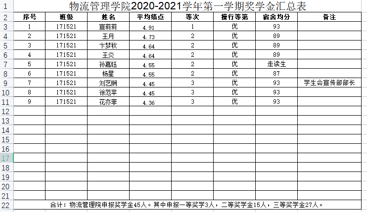 拟推荐宣莉莉等45名学生申报学校奖学金。