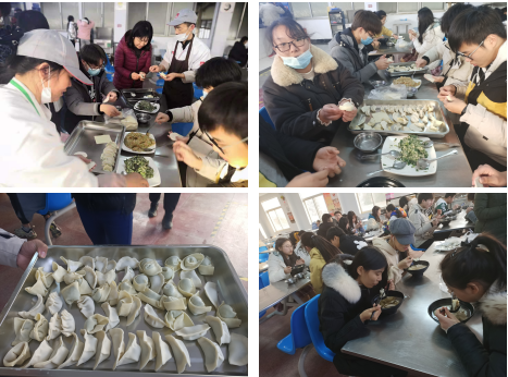 活动过程中,学生们热情很高,苏北同学会包饺子,苏南同学会包馄饨,大家相互传授技巧,不会包的同学就从食堂阿姨那取经,指导老师也一起参与实践。随着大家的努力,一个个奇形怪状的饺子出来了,有圆的、有长的,千奇百怪,大家都乐在其中,场面十分热闹。在大家的欢声笑语中一盘盘热腾腾的饺子,端上了桌子,大家一起品尝着自己动手包出的饺子。
