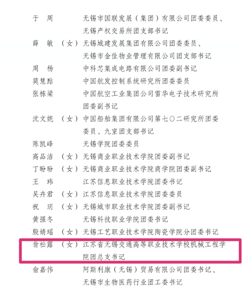 我校开云·官方端网页版登录入口信息管理学院团总支获评“无锡市五四红旗团支部(团总支)”,船舶工程学院181121(41)班李丹凤同学和信息管理学院181612班赵唯一同学获评“无锡市优秀共青团员”,机械工程学院团总支书记翁松露同志获评“无锡市优秀共青团干部”。