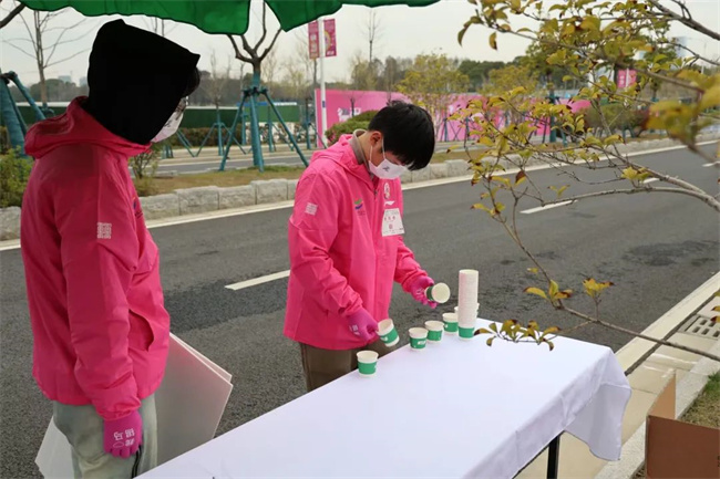 不到七点,交校的青年志愿者们已经到达指定地点,在赛事专员的指导下,完成饮料桌、食品桌、海绵桌上物品的摆放,做好前期的准备工作。在学校,他们是努力认真的学习者,在樱花赛道,他们是最美的服务者。