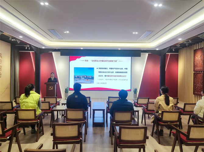 随后,在党建基地会议室,学生工作处党支部书记孙霞上了一节党课,为全体党员、入党积极分子介绍了《习近平新时代中国特色社会主义思想概论》,她指出习近平新时代中国特色社会主义思想是“一座取之不尽的富矿”。要在学习和实践中忠诚捍卫“两个确立”、坚决做到“两个维护”,高举思想旗帜,开创美好未来。