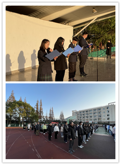 升旗仪式正式开始,全体师生为南京大屠杀的死难者默哀一分钟。接着,由信息管理学院201612班顾潇媛等同学进行演讲,表达对死难同胞的哀悼,对革命烈士的缅怀,对祖国一步步强大的自豪。最后,由倪依纯副校长进行国旗下讲话,倪校长向全体师生介绍了国家公祭日的由来,并强调我们年复一年隆重纪念南京大屠杀遇难同胞,决不是单纯为了纪念,而是要我们每一个人牢记历史,勿忘国耻,奋发图强,振兴中华!