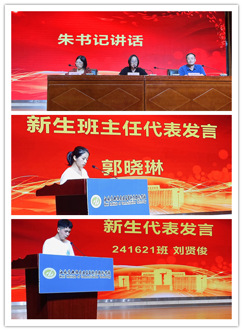 典礼在雄壮的国歌声中拉开帷幕。同学们观看了学校宣传视频,对自己的学校和专业有了更深刻的了解。伴随着热烈的掌声,学院新生班主任们为新生班助理班主任颁发聘任证书,鼓励他们协助做好班级建设工作。学院新生班主任代表郭晓琳老师发言,望同学们能立鸿鹄之志,以积极向上的精神风貌迎接新的学习生活。新生代表241621班刘贤俊同学发言,他认为在校期间应认真学习,开启自己求是创新的新征程,练就求真求实的真本领。接着,郑智飞院长希望全体同学端正态度,领悟纪律的含义、规范的意义,领悟生活的真谛、生命的价值,在思想认识和行为方式等方面再上新台阶。最后,朱雨兰书记讲话。朱书记强调强健的体魄和坚毅的品格乃是担当大任的先决条件,更是通往成功之路所必备的素质,并引用奥运健儿们的卓越表现,勉励同学们要在实践中充实自我、锻炼自我,敢于担当、善于作为,为国家富强、民族复兴、人民幸福贡献信息学子的青春力量!