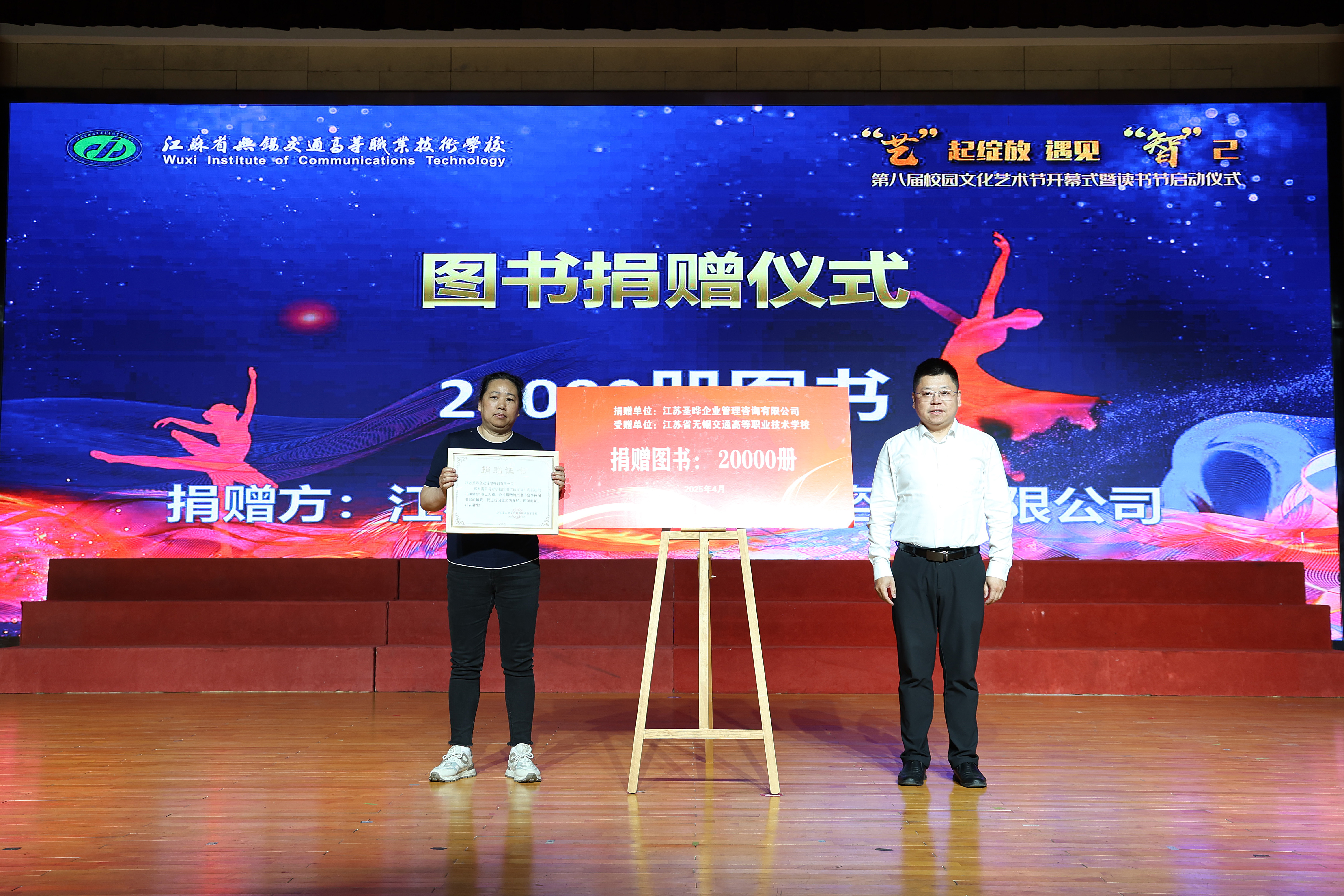 活动中,副校长范次猛为2024年度“书香个人”颁奖,这些“以书为友”的阅读榜样,不仅在个人成长中以阅读为伴,更是学校阅读文化的积极传播者,他们的阅读故事在学校内激励着更多的师生走进图书馆,爱上阅读。同时,江苏圣晔企业管理咨询有限公司向学校捐赠2万册图书,副校长王珏代表学校接受捐赠,并感谢企业助力书香校园建设。