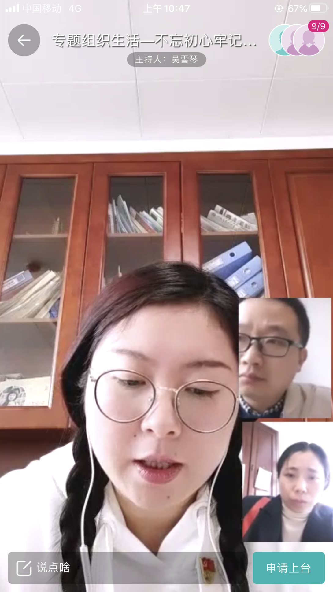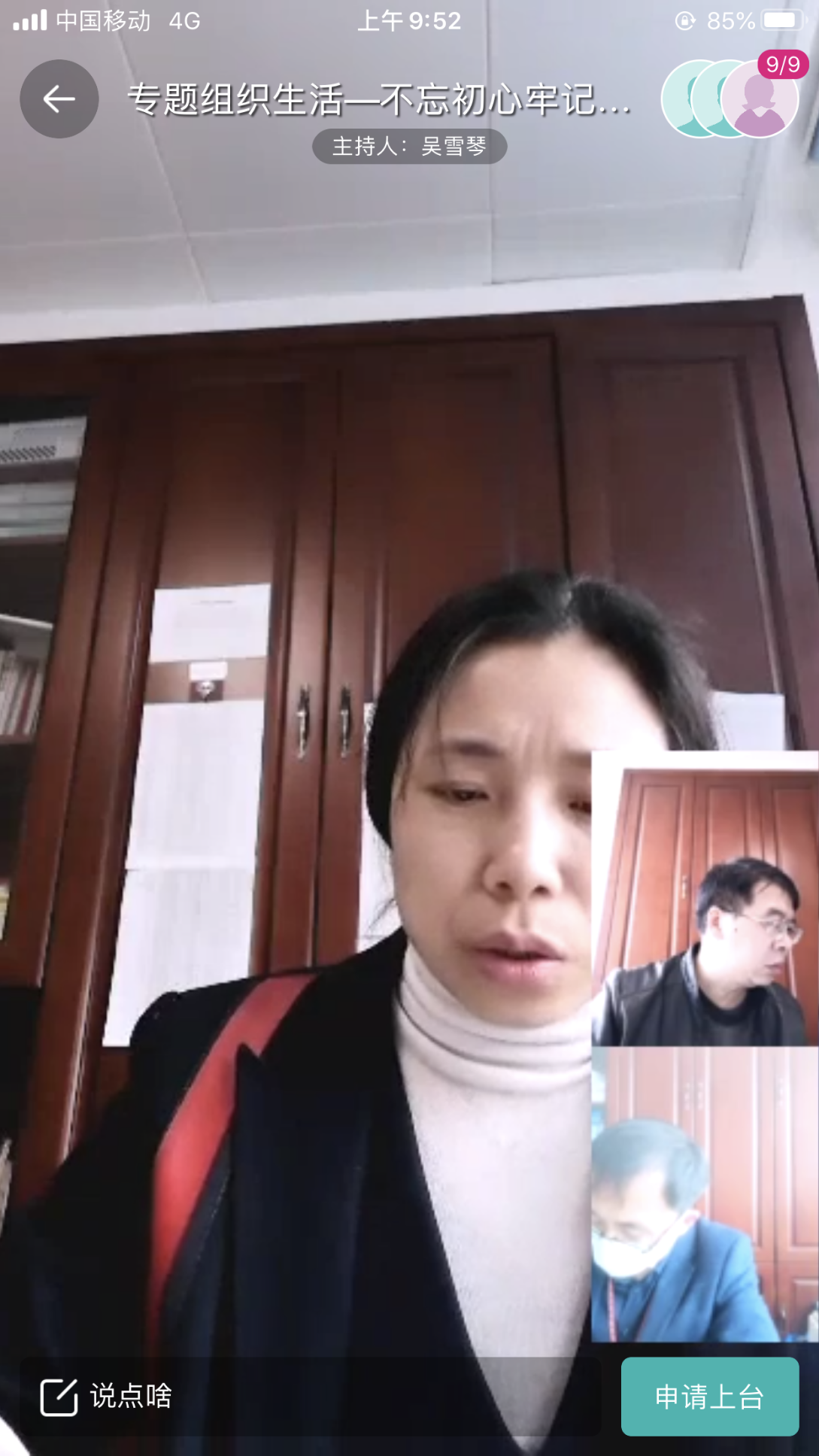 2020年3月19日,学工招办安保党支部在智慧校园平台召开“不忘初心、牢记使命、在抗击疫情中敢担当”专题组织生活,会议由党支部书记吴雪琴主持,支部所辖的学生工作处、团委、招生就业处、安全保卫处的全体支部党员参加。